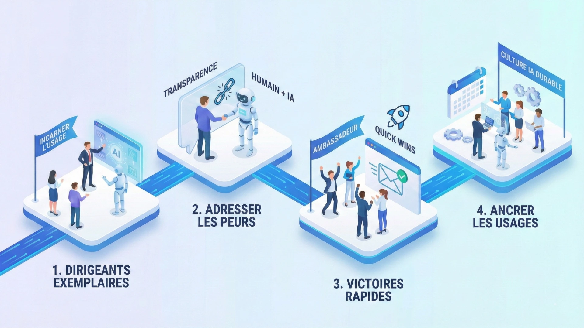 L'acculturation IA doit être incarnée par le haut. Si le dirigeant continue de demander des comptes-rendus manuels alors qu'il a payé pour une IA qui le fait, le signal est désastreux. Les équipes interprètent l'absence d'usage par la direction comme une permission tacite de ne rien changer.