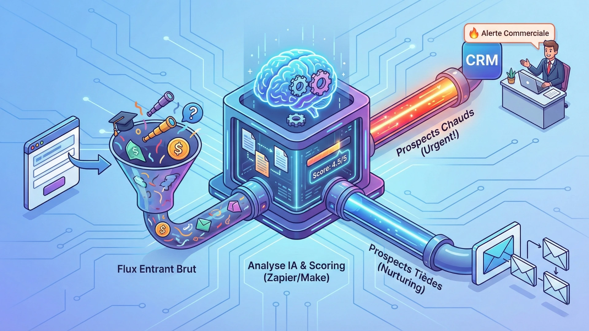 Grâce aux outils d'automatisation modernes (Make, Zapier, n8n) couplés à une IA générative, c'est aujourd'hui accessible sans savoir coder. C'est d'ailleurs l'un des scénarios les plus rentables que nous recommandons dans notre guide des cas d'usage IA pour PME. Voici la méthode pour construire ce "filtre intelligent".