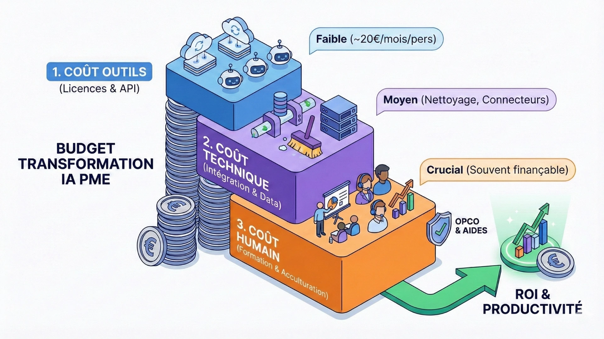 Le budget transformation IA PME se compose généralement de trois tiers : 1. Les coûts de fonctionnement (OpEx) liés aux licences SaaS (ex: ChatGPT Team, Copilot) et à la consommation d'API. 2. Les coûts d'intégration technique (CapEx) incluant le nettoyage des données et le développement de connecteurs sur-mesure. 3. Les coûts de conduite du changement (Formation, Acculturation) indispensables pour garantir l'adoption des outils par les équipes.
