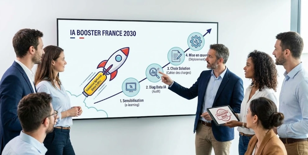 Le dispositif IA Booster France 2030 est un programme d'accompagnement opéré par Bpifrance pour les PME et ETI. Il finance jusqu'à 50% des prestations de conseil en intelligence artificielle, allant du diagnostic de données (Diag Data IA) au choix et au déploiement de la solution technique.