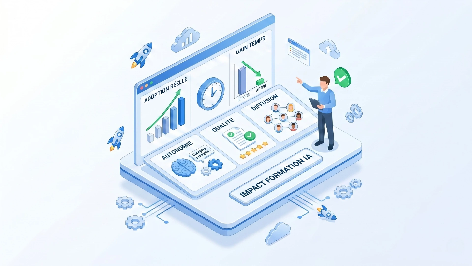 Mesurer l'impact d'une formation IA en entreprise repose sur 5 indicateurs concrets : l'adoption réelle des outils, le gain de temps par tâche, l'autonomie acquise, la qualité du livrable produit avec l'IA et l'effet d'entraînement sur les pairs. La satisfaction post-formation ne suffit pas.