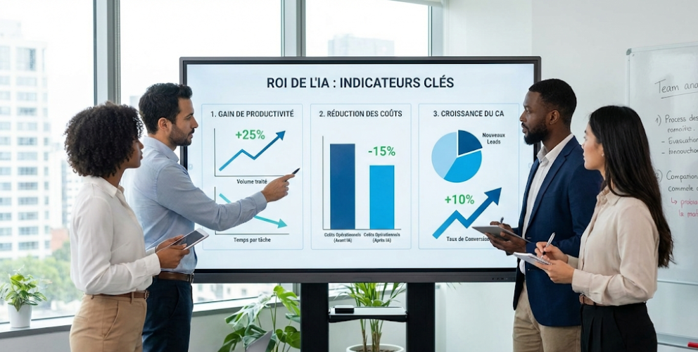 Le ROI de l'IA (Retour sur Investissement) pour une PME se calcule en comparant le coût total du projet (licences logicielles + coût de la formation des équipes) aux gains générés. Ces gains se mesurent principalement en heures de travail économisées, en réduction des coûts liés aux erreurs, et en augmentation du chiffre d'affaires grâce à une meilleure réactivité commerciale.
